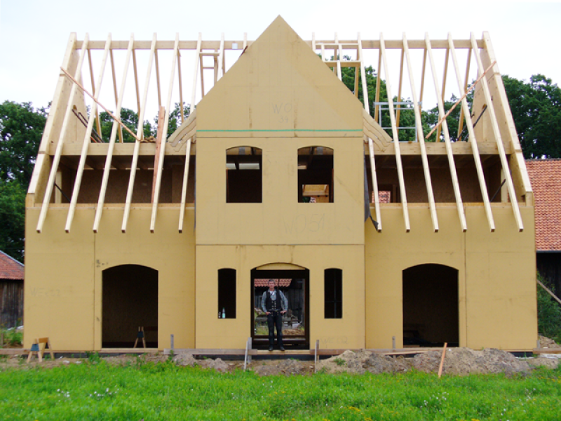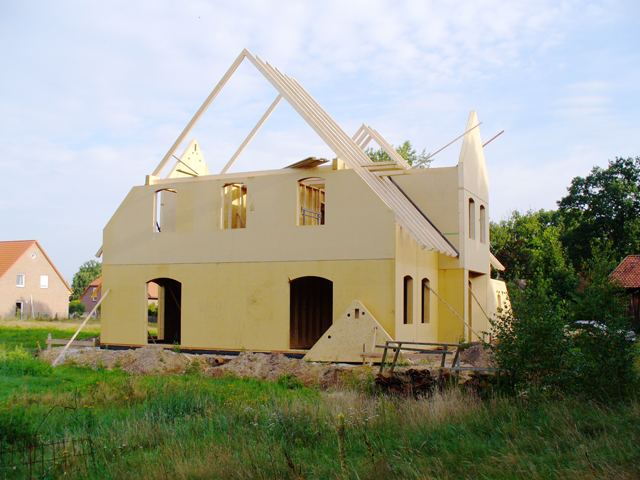 Von außen ist es oft nicht zu erkennen: Dieses klassisch gestaltete Haus ist im Kern ein Holzrahmenhaus. Und in der Fassade steckt die ganze Kunst und Erfahrung des Maurerteams: Hier wurden Rundbögen über den Fenster angeordnet, Ecken hervorgehoben, horizontale Bänder zeigen die Geschosse an und auch entlang der Dachneigung lockern Mauerwerksbänder die Fassade auf. Die Dacheindeckung besticht durch die Wahl einer bunten Tonmischung.