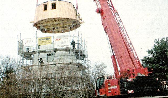 „Es sieht ja doch ganz gefällig aus“, sagte Mühlenbesitzer Wilfried Künstler erleichtert, nachdem am Dienstagnachmittag das am Boden gefertigte Dachzimmer mit einem Autokran in zehn Metern Höhe auf das Mauerwerk der einstigen Windmühle gesetzt worden war. „Unten hatte das alles so gewaltig ausgesehen“, betonte er.
