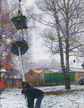 Er dankte allen, die bei der Ausführung mitgeholfen hatte, insbesondere Andreas Witte, der sich nicht nur für die Nestunterlage engagiert habe. Dann legten die Männer von der Fuhrberger Zimmerei Hand und Kran an und richteten den schweren Pfahl mit der Unterlage obendrauf auf und befestigten es im Fundament.