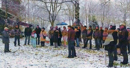 Ungemütlich war es im Schneeregen an diesem Morgen, aber dennoch hatten sich gut 40 neugierige Gäste eingefunden. Andreas Stockelbusch begrüßte sie und erläuterte noch einmal, wie er auf den Gedanken gekommen ist, diese Nisthilfe aufzubauen: Schon mehrmals hätten sich Weißstörche seine Schornsteinabdeckung angeschaut, sie aber als Nistplatz wohl wieder verworfen, weil sie abschüssig ist. Allerdings hätten sich die Störche für die vielen Frösche lebhaft interessiert, die er wegen seiner beiden Teiche auf dem Grundstück habe.