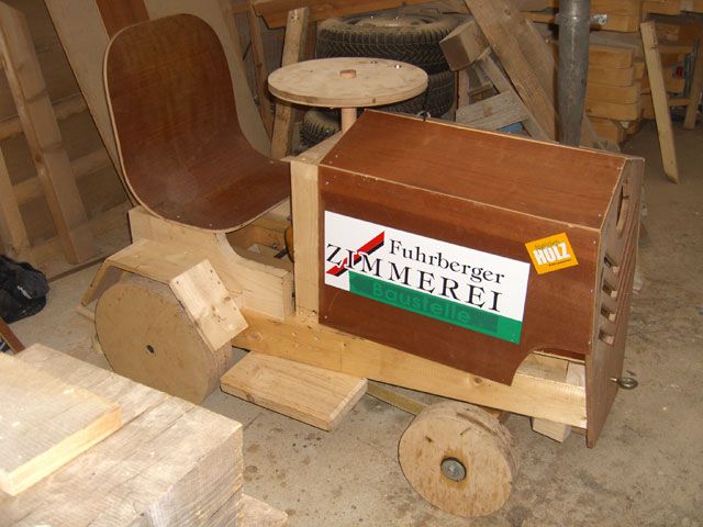 Zum traditionellen Rasenmähertreckerrennen in Thönse bauten Kristoffer Engelke und Lars Meixner unseren Trecker aus Holz – funktionstüchtig!